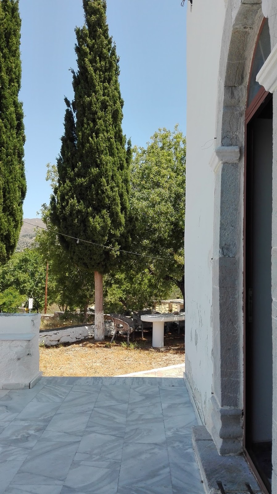 We eten 's avonds op het terras van de schooldirecteur een lekkere, plantaardige maaltijd, grote bonen in tomatensaus, gegrilde zucchini en aubergine, patat, brood, olijven en eindigen met een minidrankje met de eigenaar die op Frans Molenaar lijkt.