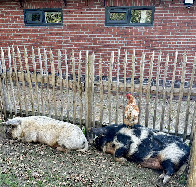 In de mooie tuin hebben ook twee Kune Kune varkens een plek, Billie en Bollie. Er is een haan, Dzjengis Haan, plus een hen. De rest van de hennen van Red een legkip zijn inmiddels overleden.
